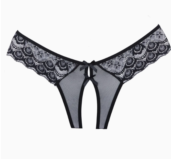 Foray into pleasure without a thought. Open panty with thick lace bands hugging the sides, dual bow trim with skinny back straps. Crotchless.