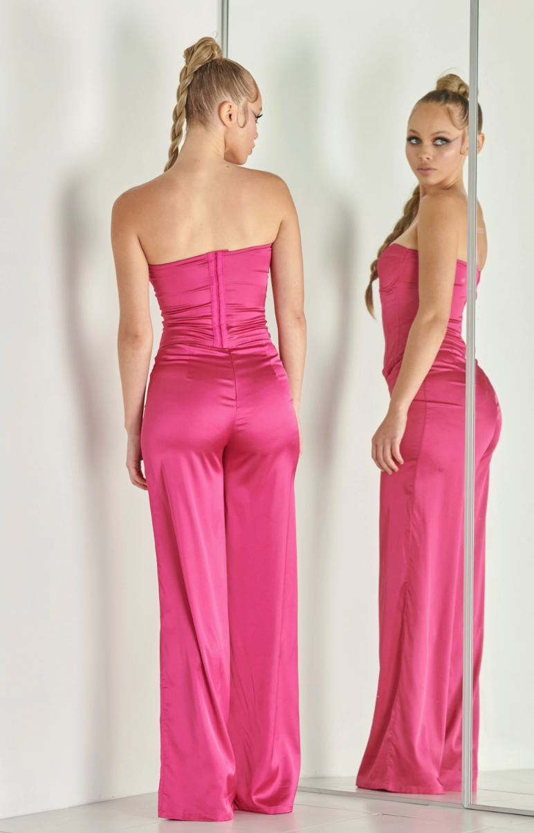 2 pc satin set featuring a corset top and pant. Straight fit pant flatters and hugs at the hip with minimal stretch. Our distinct bust detail stands out on its own with semi-pointed cups, hook and eye closure at the back. Model measurements for reference: Bust: 33" Waist: 23" Hips: 36" Height: 5'6"