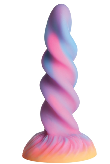 Magic comes in many shapes and sizes, and this Moon Rider Unicorn dildo is the perfect shape for you! The sunburst of purple, blue, pink and yellow colors are bright during the day and when it gets dark the glow in the night! It has a small, pointed tip for easy insertion and a spiral horn with soft, round edges. Made out of premium, flexible, phthalate-free silicone, this dong is body-safe and best used with water-based lubricants only. Enjoy hands free rides due to the strong suction cup base! Invite a partner to indulge in kinky cosplay or fantasy roleplay and use their favorite harness to transform this dong into a strapon!
