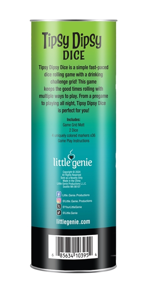 Get ready to roll the dice and your eyes with Tipsy Dipsy the game that guarantees laughter, and maybe some questionable dance moves! This fast-paced dice-rolling extravaganza comes with a drinking challenge grid that's sure to keep the good vibes flowing faster than your favorite bartender on a Friday night. Perfect for 2-8 players aged 21 and over, Tipsy Dipsy is your ticket to a night of fun whether you're pre-gaming or partying till the sun comes up. Each set includes everything you need to dive into the hilarity 1 game mat also doubles as a handy spill-catcher, two dice for double the trouble, 36 markers to keep track of who’s tipsy or just plain dipsy, and an instruction sheet because even chaos has rules. So gather your squad, roll those dice, and let Tipsy Dipsy take your next get-together from meh to OMG did that just happen Cheers to unforgettable nights—grab your game today!