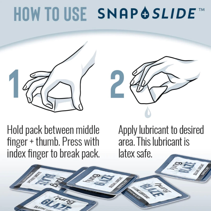 Going the distance? HUNG Glaze silicone lubricant is the perfect counterpart for marathon sessions or for getting it on in the shower. Formulated to be super smooth, never sticky and packaged in convenient, travel-friendly Snap + Slide™ single use packets that dispense just the right amount of lube at the right time. HUNG Glaze is made with body-safe ingredients that are condom safe, paraben free, glycerin free, gluten free & vegan.