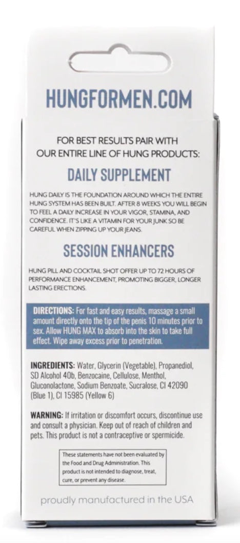 Perform like a champion every time with HUNG Max! This revolutionary gel formula extends your pleasure without losing any stimulation so you can enjoy the moment at your pace. This gel formula allows for a clean, precise and discreet application and the mint flavor makes it great for oral play! Hung Max is paraben free, gluten free and is condom safe. Go the distance and take it to the Max!