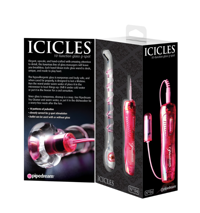 Winner of 2011 AVN "O" Award for Outstanding Powered Product! 10-Function Glass G-Spot Vibrating Wand Elegant, upscale, and hand-crafted with amazing attention to detail, this luxurious line of glass massagers will leave you breathless. Each hand-blown Icicle glass wand is sleek, unique, and made to play hard. The hypoallergenic glass is nonporous and body safe, and when cared for properly, is designed to last a lifetime. Run the wand under warm water to heat things up, or chill it under cold water for a cool sensation. Use with plenty of Moist Body Lotion for an extra wet and wild experience! Cleanup is a snap after the fun with Pipedream Toy Cleaner and warm water. -10 Patterns of Pulsation -Bullet Can Be Used With or Without Glass -Curved for G-Spot Stimulation Length: 7 in. (17.8 cm) Insertable Length: 5.75 in. (14.6 cm) Width: 0.75 in. (1.9 cm)