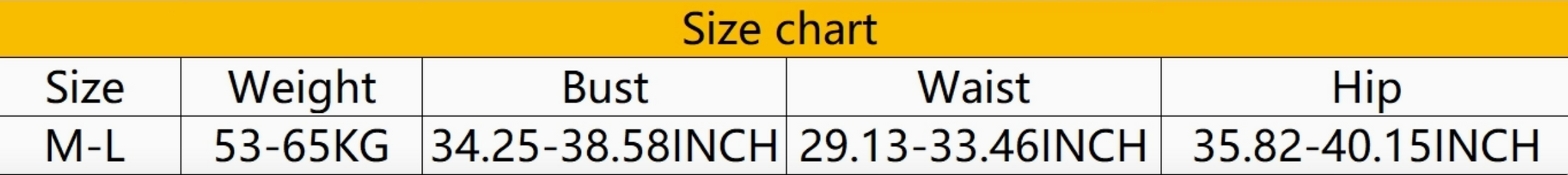 Size: M-L Weight: 53-65KG Bust: 34.25-38.58INCH Waist: 29.13-33.46INCH Hips: 35.82-40.15INCH