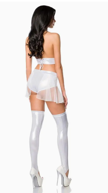Sexy gogo set in metallic look Extravagant halter neck top Hook and loop fastener at the neck Lacing at back Panties with attached chiffon skirt Gauntlets with bar and elastic leg ending Skirt length in size s ca. 27 cm