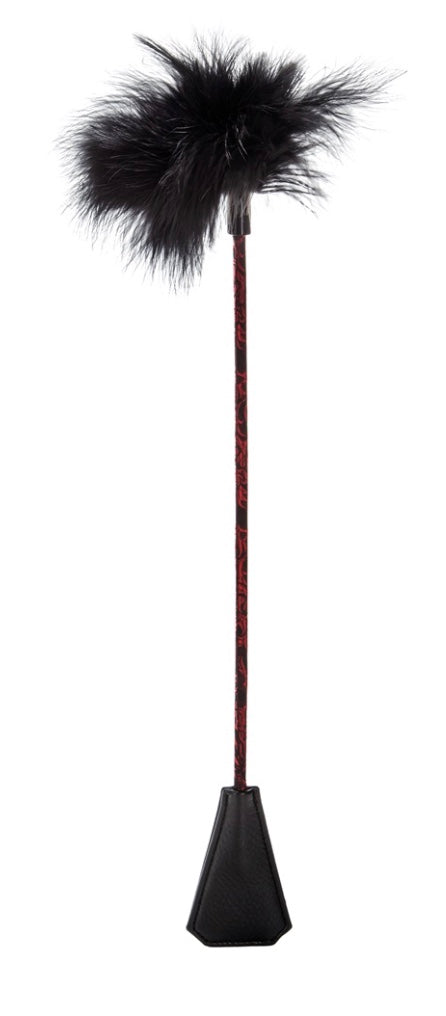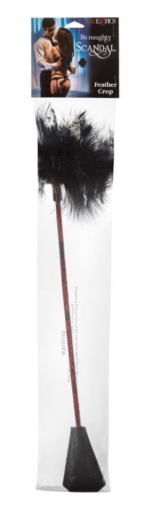 Are you feeling scandalous or sweet tonight? With the Scandal Feather Crop, you won’t have to choose…and you can even tease your partner all night by switching between naughty and nice. This elegant crop is a hand-stitched, dual ended crop and tickler. The sturdy crop with designer accents on one end can deliver a gentle, tingling tap or a sweet, stinging blow to leave the submissive’s skin singing with the memory of the crop’s touch. Explore that tiny line between pleasure and pain with this double-ended crop; for a softer touch, turn it around and feel the playful, tickling touch of the feather teasing down your stomach or across your soles. Play with the addicting contrast in sensations between the innocent touch of the feather and the naughty, breathtaking embrace of the crop against your skin. If the dominant side is more your style, watch your lover squirm in anticipation as you tease them slowly and let the feather send shivers down their spine….and then surprise them with the radiating, forceful kiss of the crop. Spice up an ordinary evening of play or perfectly compliment a foray into bondage and restraints. It’s perfectly designed for beginners and the advanced alike. Hit as firmly or as softly as you like. Test the boundaries of trust and succumb to desire tonight.