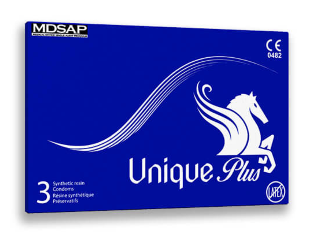 3 lubricated latex-free condoms in a credit card sized package. Experience more pleasure and higher sensitivity with Unique Plus for large size men. Unique condoms are vegan and odorless. They are 3 times stronger and thinner than latex.
