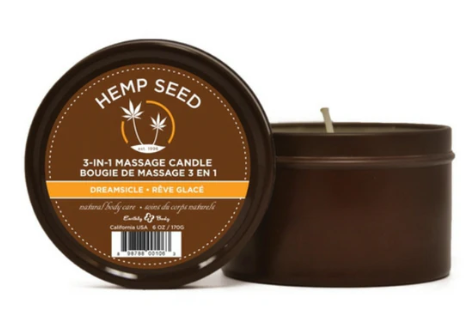 - Hemp seed candle - Earthly Body Sun touched Candle with Hemp (1z Dreamsicle)This hand poured fragrant natural soy oil Massage Candle burns long clean. It melts into a warming silky massage oil that penetrates and moisturizes the skin. Eight natural oils including hemp seed vitamin E jojoba avocado apricot leave skin soft and smooth. Use right out of the shower or bath. 10% vegan non toxic.